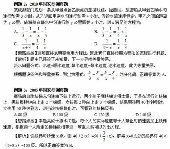 一般说来,行程问题、工程问题、盈亏问题、鸡兔同笼问题、和差倍比问题、浓度问题、利润问题等均可使用方程法。但是具体问题还需要具体分析,如果题中数据关系比较简单,或者可以直接利用现有公式时,使用方程法反而会影响答题效率。