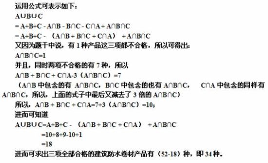 图中黑色部是同时两项不格的产品集合,灰色部是这三项都不合格的产品集合。计算至少有一项不达标的产品的种数时候,黑色部分重复计算了一次,灰色部分复计算了两次,所以,至少有一项不达标的产品的种数有10+8+9-7×1-1×2=18(种)进而可求出三项全部合格的建筑防水卷材产品有(52-18)种,即34种。