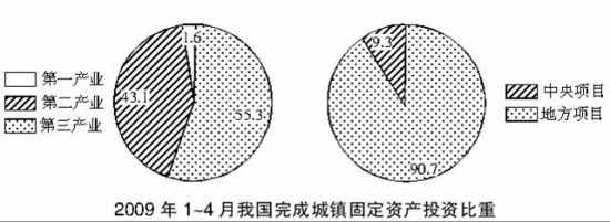 2009年1~4月我国完成城镇固定资产投资为37082.30亿元,比去年同期增长30.5%,其中第一产业比去年同期增长82.1%,投资比重见下图。