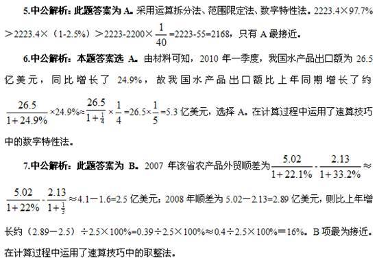 1.中公解析:此题答案为B。采用乘除转化法、取整法。5784÷(1+3%)≈5784×(1-3%)=5784-5784×3%≈5784-6000×3%=5784-180=5604,只有B最接近。
