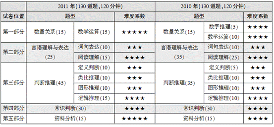 2.从题型上来看,2010年数量关系部分包括传统的两种题型,即数字推理和数学运算。而2011年的考试中,题型发生了变化,数字推理部分不再作为考查内容,而只考查了数学运算一种题型,但是总体难度却比2010年有所增大,体现了向国考靠拢的趋势。