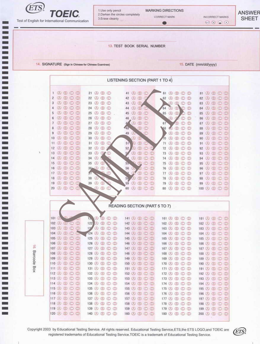 • 答题卡背面: 答题页样张 TOEIC Answer Sheet (右键调出菜单,选择“目标另存为”下载)