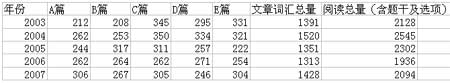 下面这张表格是04至06年福建卷阅读理解四大题型所考察的具体题目数量。